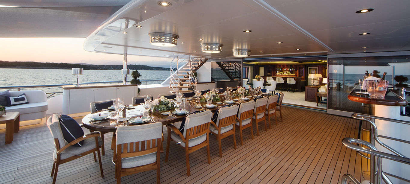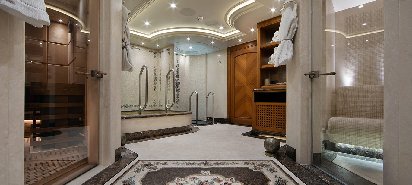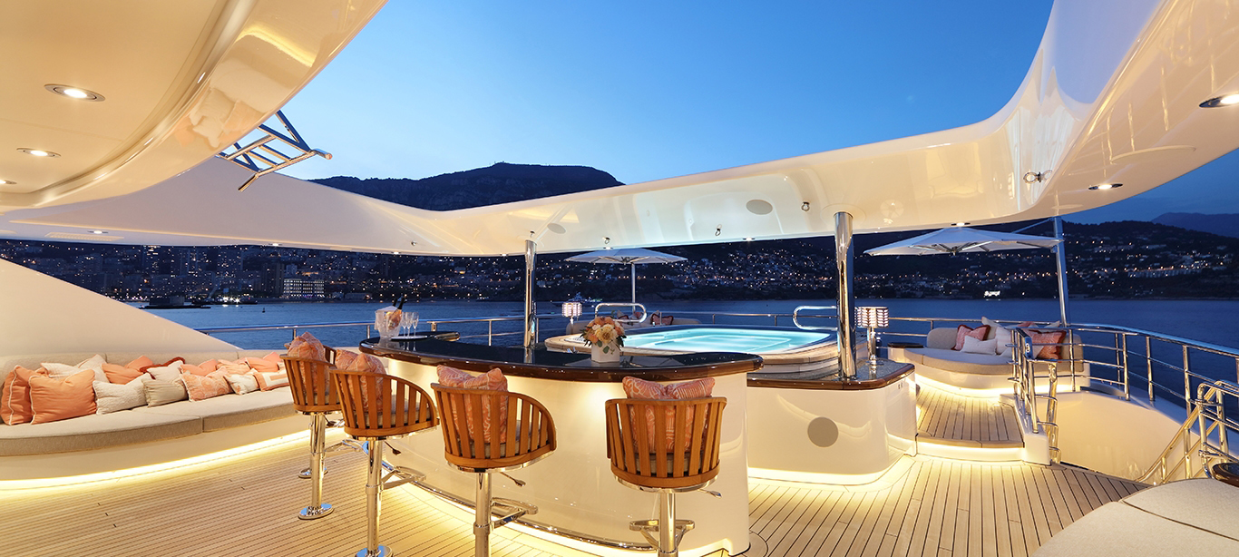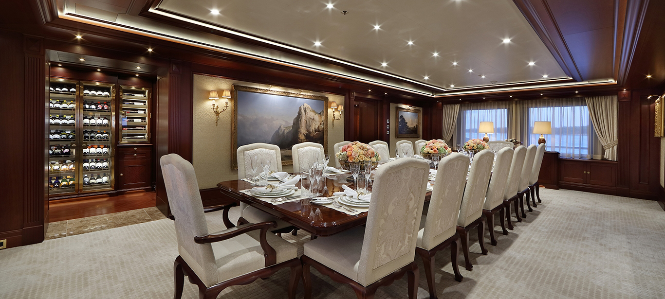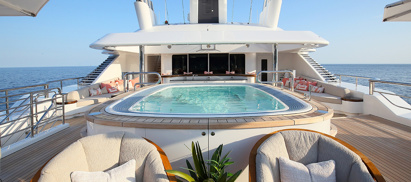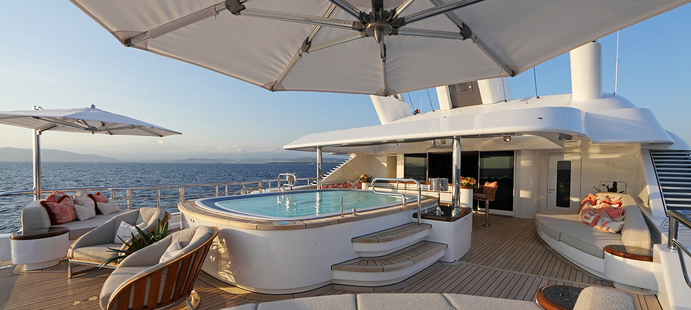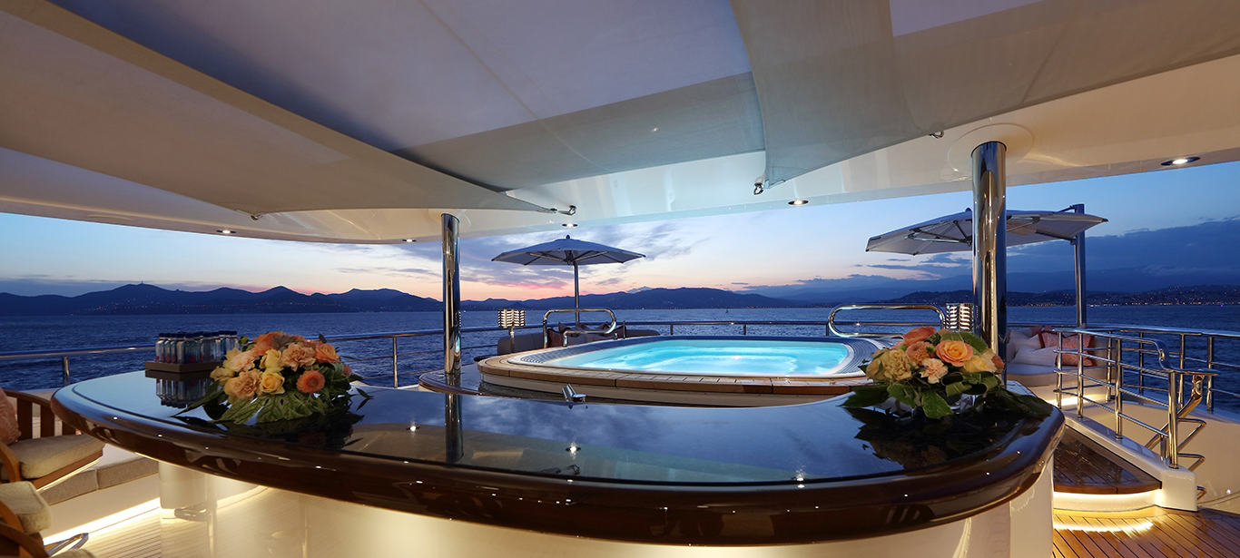 She was designed with entertaining in mind, and accommodates 18 guests in 9 en suite staterooms plus staff. The Owner's stateroom is complete with his and hers baths and wardrobes. Boasting an array of comforts and amenities including a helipad, sports room for water and land toys, a spa and beach club. Guests will marvel in the excellent exterior deck space including a Jacuzzi.